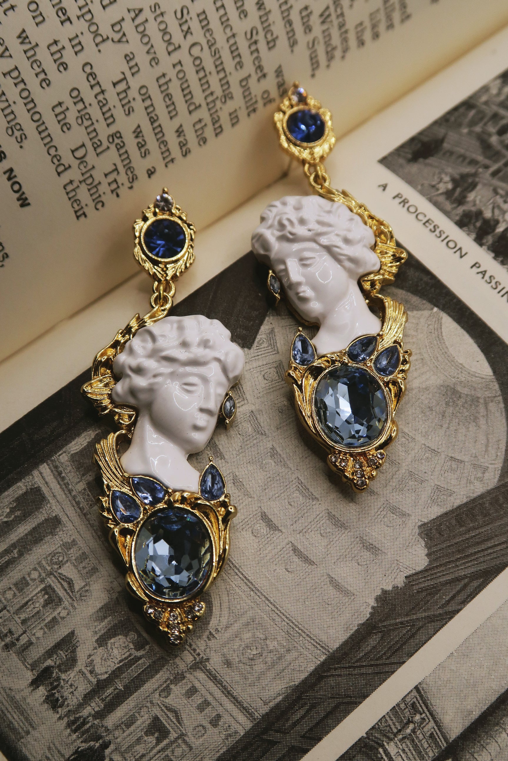 Transport your style to the era of myths and legends with these striking Aphrodite's Embrace Earrings. Featuring a beautifully sculpted female bust in a lustrous white finish, each earring is accented by a deep blue, multifaceted gemstone and a delicate gold-toned wing. These earrings are a timeless statement piece, perfect for adding a touch of classic elegance to any look.