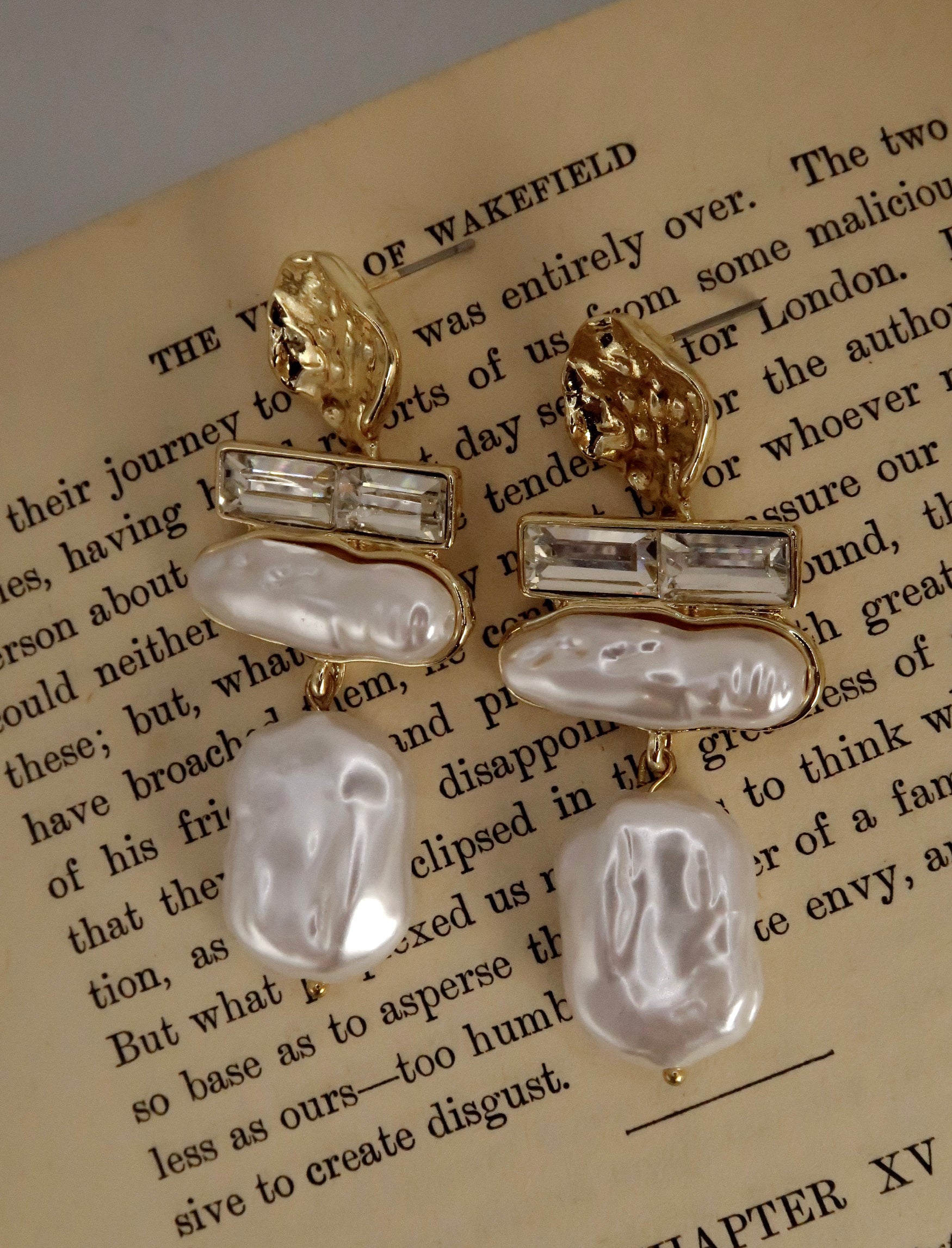 Perfectly blend organic texture with polished modernity. They feature a rugged, hammered gold-tone stud that connects to a clear, rectangular baguette-cut crystal accent. The bold look is finished with two suspended lustrous baroque faux pearls, known for their unique, irregularly organic shape. These are a sophisticated, art-deco-inspired piece perfect for the fashion-forward individual.