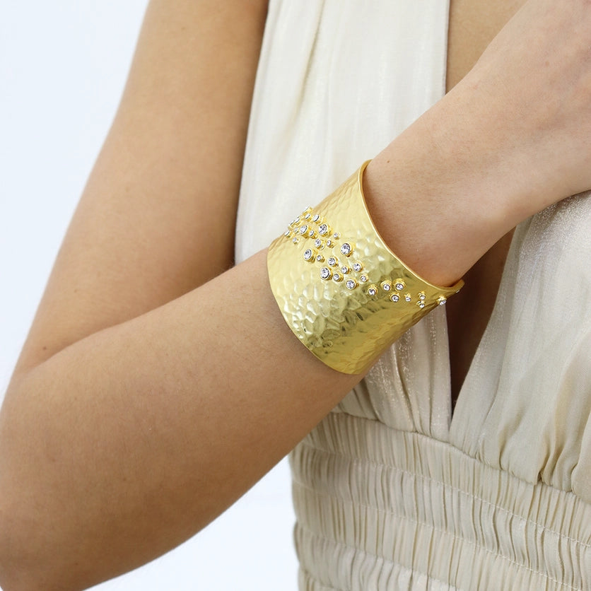 Coax your glamorous, sultry self out of hiding. Our hammered cuff of precious metal is festooned with a diagonal sprinkle of faux diamond crystals in what can only be mathematically hailed as ‘bling squared’.