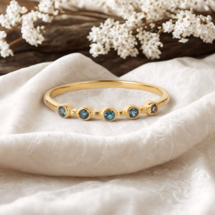 This refined band showcases five round London Blue Topaz stones in sleek bezel settings. Made from 925 Sterling Silver with a durable 18K Gold Vermeil coating, it offers lasting color and quality. Its timeless design works well alone or stacked, making it a perfect gift for December birthdays.